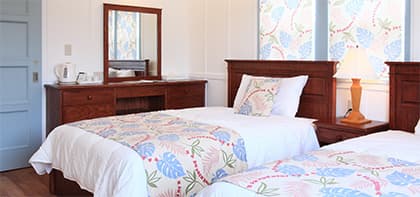 お部屋はハワイアンな枕カバーやベッドカバーのセミダブルのベッド、広々としたテラスから眺める事が出来る小笠原の山や海はゆったりと流れる小笠原ライフには欠かせないアイテムです。